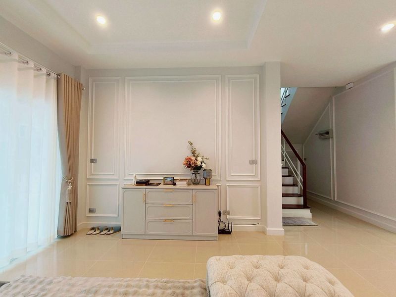 - ชั้นบน : 3 ห้องนอน 2 ห้องน้ำ (ห้องนอนใหญ่มีห้องน้ำในตัว) มีเเทอเรสหน้าบ้าน